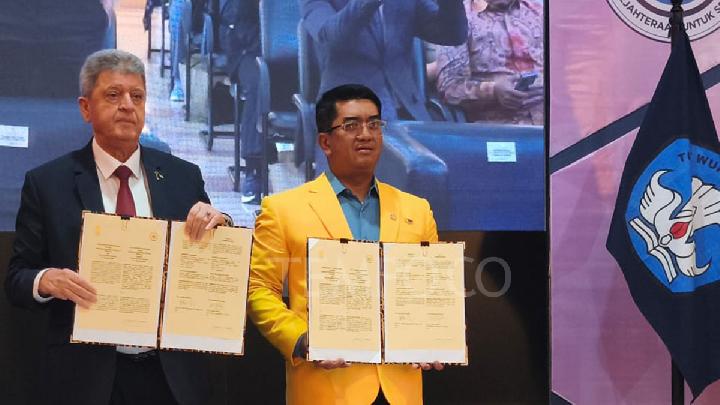 Rektor UI Heri Hermansyah dan Duta Besar Palestina Zuhair Al Shun menandatangani MoU dalam pembukaan Festival Pengmas 2025 di Ruang Apung, Gedung Perpustakaan Pusat, Kampus UI, Depok, Jawa Barat, 1 Oktober 2025. Tempo/Ricky Juliansyah